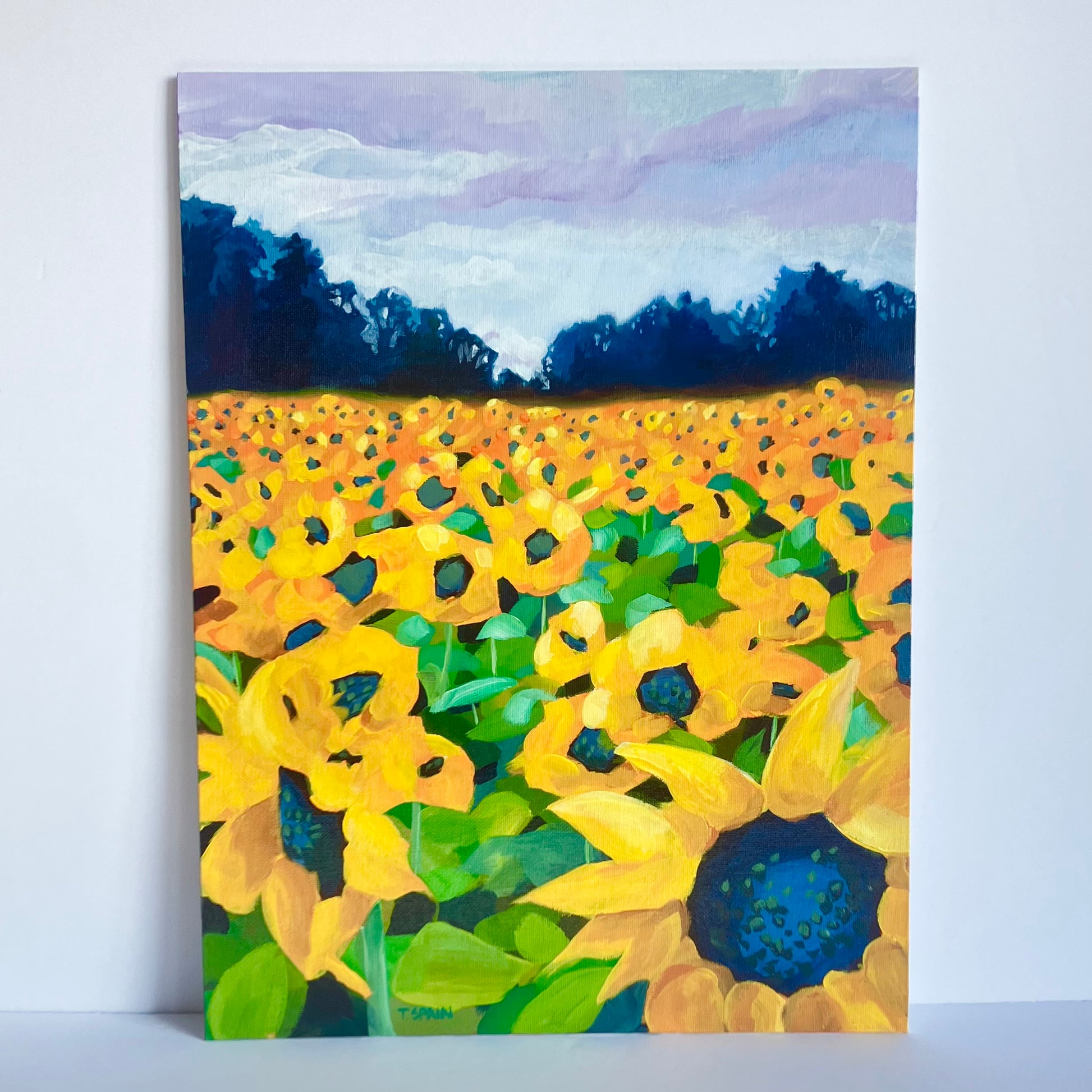 A beautiful field of golden glowing sunflowers standing tall. Original one of a kind 12x16" acrylic painting on canvas board. Easy to frame.