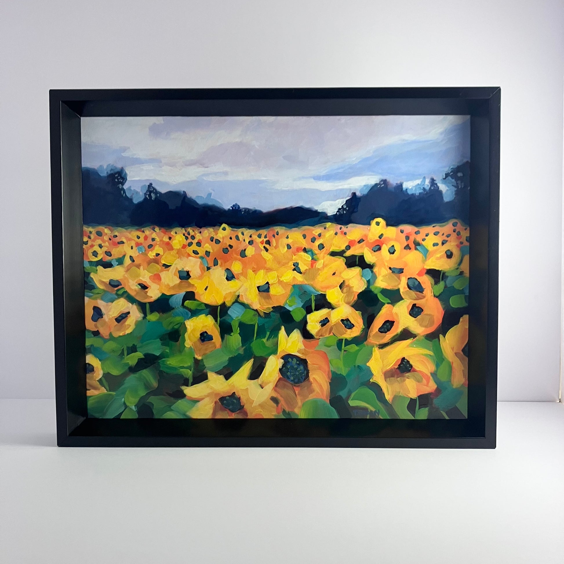 A field of sunflowers following the sun. Original 11x14" acrylic painting, framed in a painted wooden frame. Hardware on the back, ready to hang.