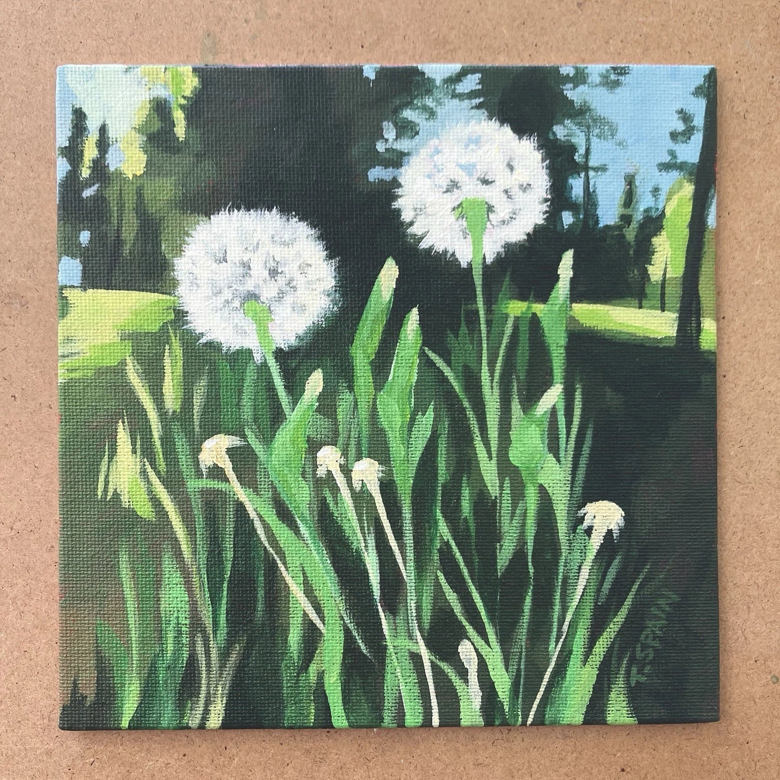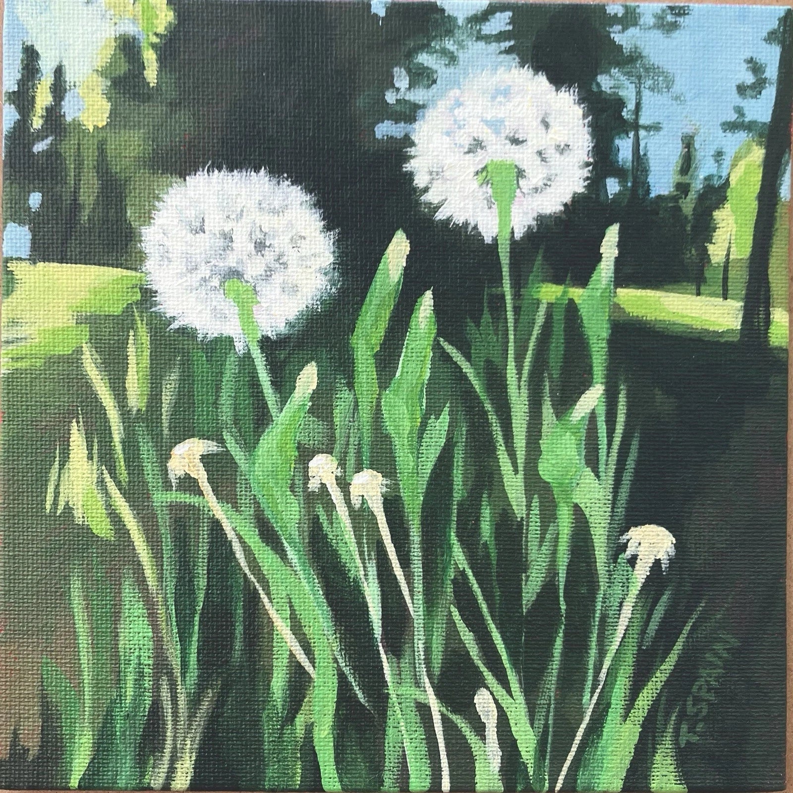 “Gone to Seed” original artwork. A tiny landscape painting full of light and color, capturing the beauty of weeds by the side of the road. Little things that we often don’t notice.