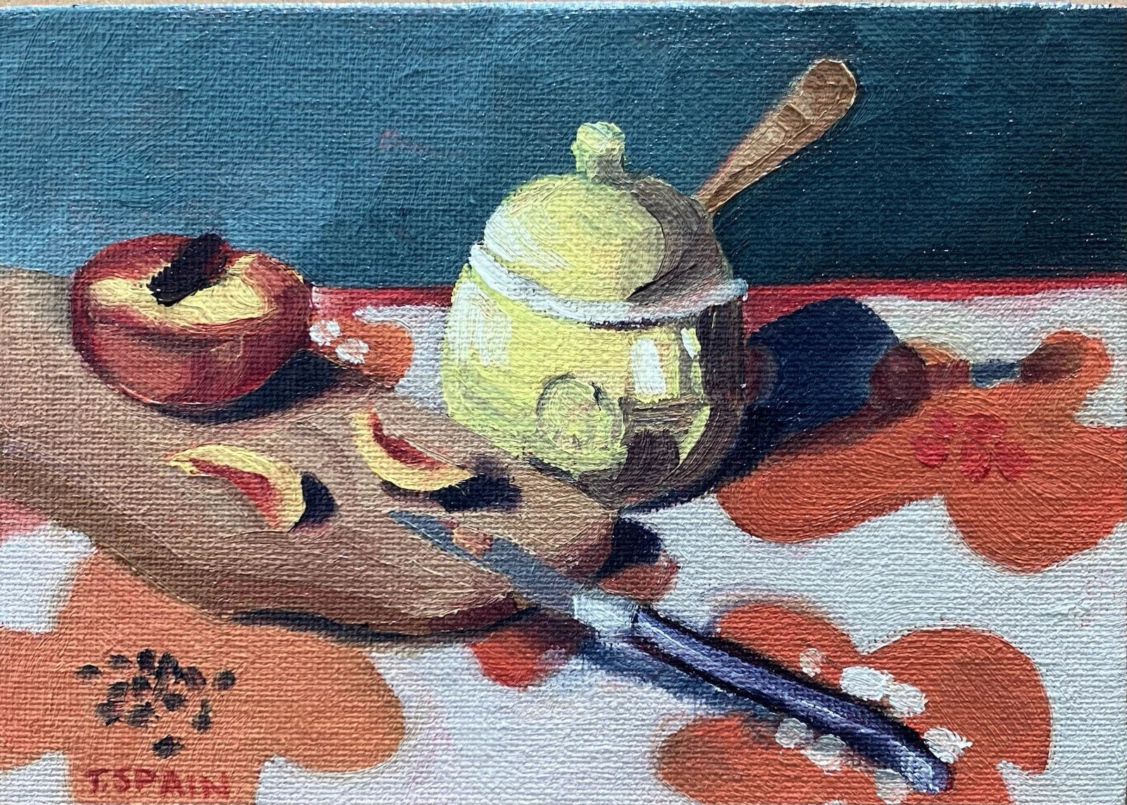 "Honey Pot" original artwork. A colorful kitchen scene done in oil paints on a tiny canvas. Add some fun to the kitchen decor by hanging this mini art somewhere unexpected.