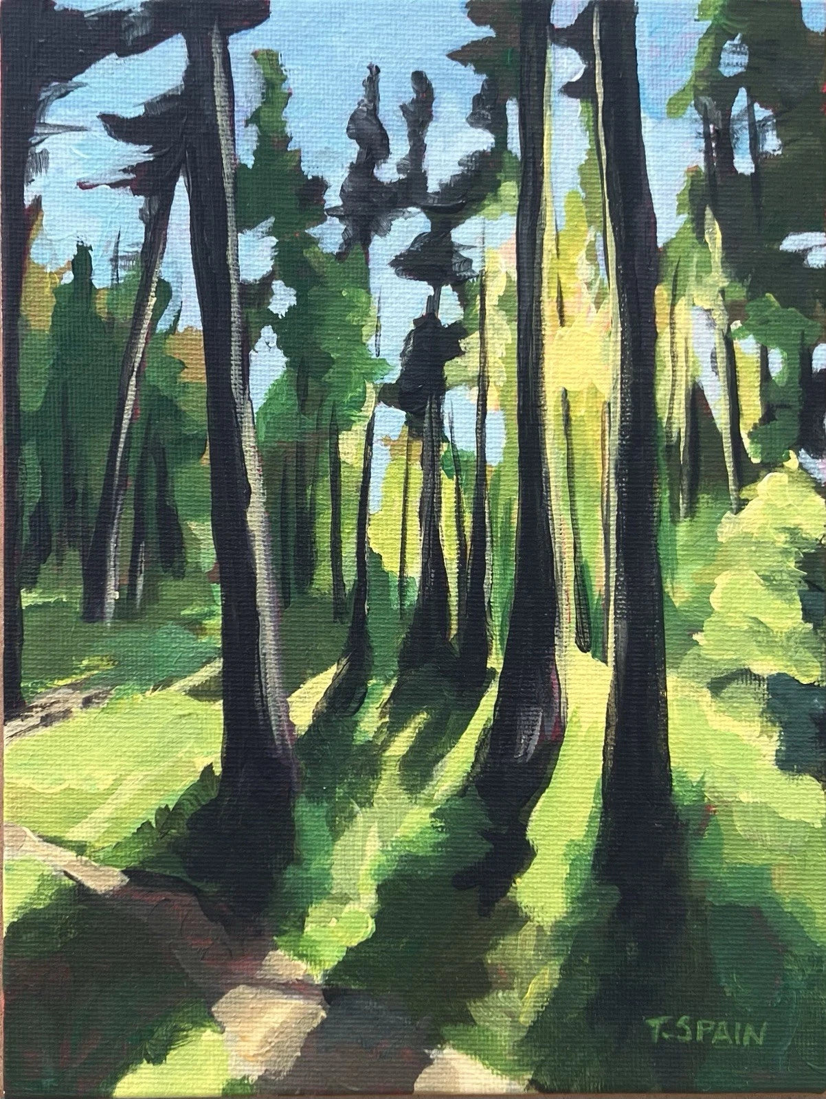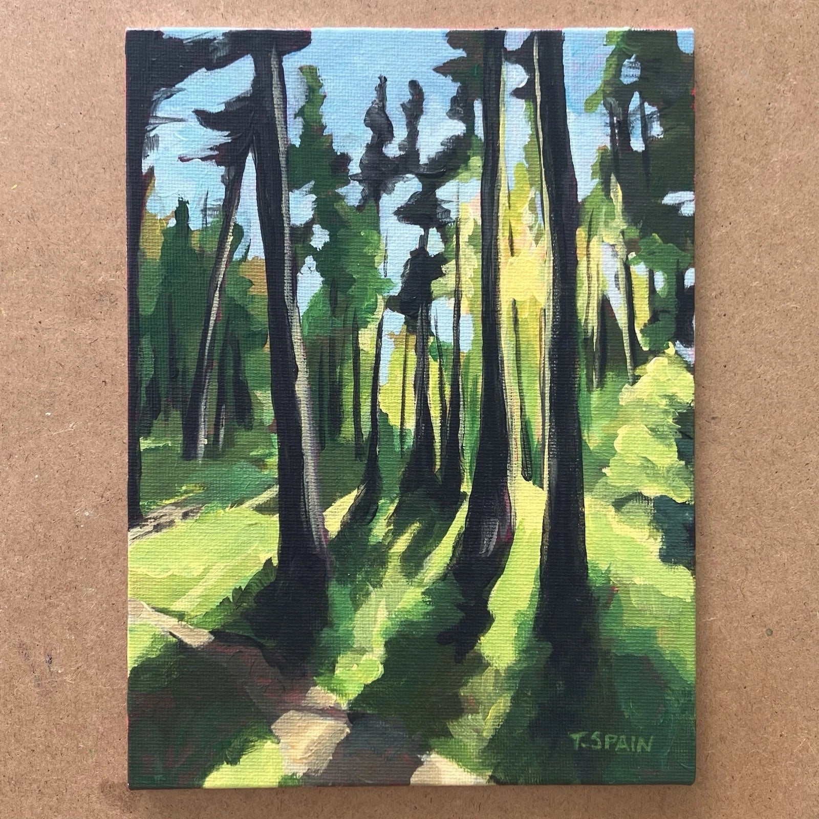 “Morning Walk” original artwork. A tiny landscape painting full of light and color, capturing the trees in the early morning light.