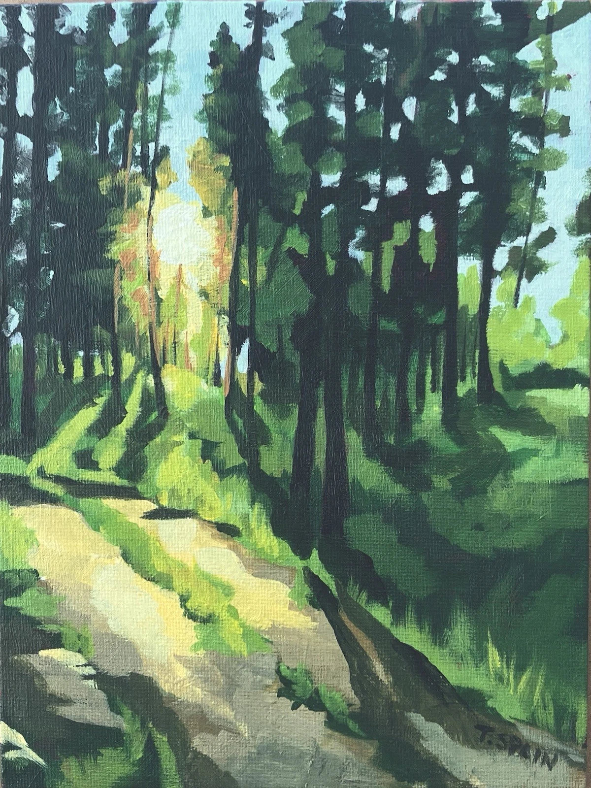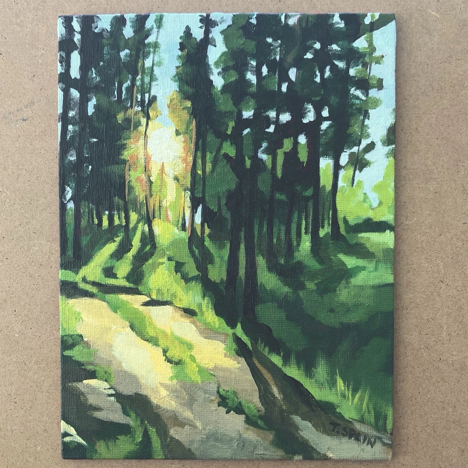 “Quiet Morning ” original artwork. A tiny landscape painting full of light and color, capturing the trees in the early morning light along the trail.